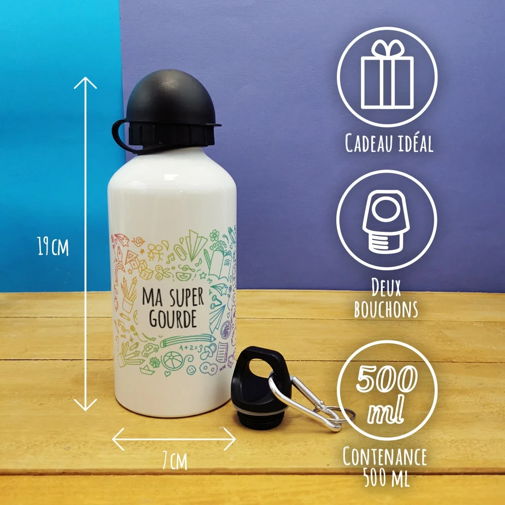 Offrez un peu de fraicheur grâce à cadeau qui reste pour une fille pour la rentrée scolaire de votre fille avec cette gourde. Sur cet gourde il est écrit ” Ma super gourde ” sur l’avant. Avec sa contenance de 500ml, cette gourde en métal est idéale pour un enfant grâce à sa légèreté.