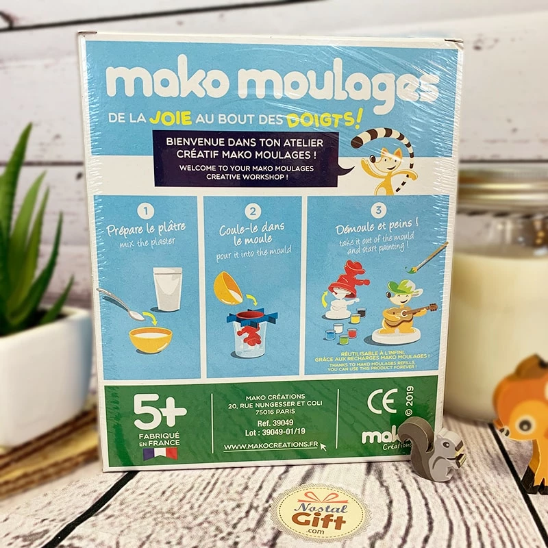 – Le coffret contient : 1 moule d’écureuil + 1 moule de renard + 1 moule de hibou, 6 pots de peinture, 1 pinceau, 3 sachets de plâtre (80g) refermable zippé et 4 croisillons pour tenir les moules.
