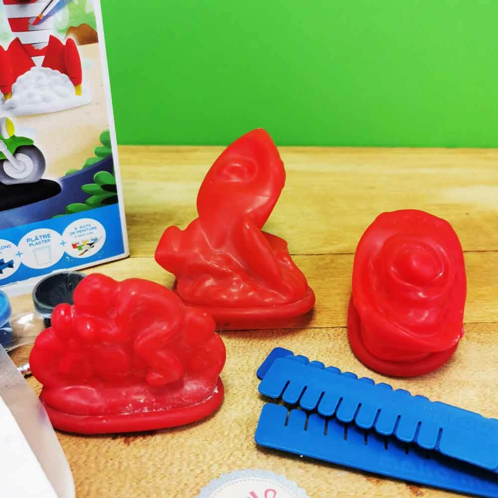 – Le coffret contient : 3 moules, 6 pots de peinture, 3 sachets de plâtre (3x150g), 1 pinceau et les croisillons pour tenir les moules.