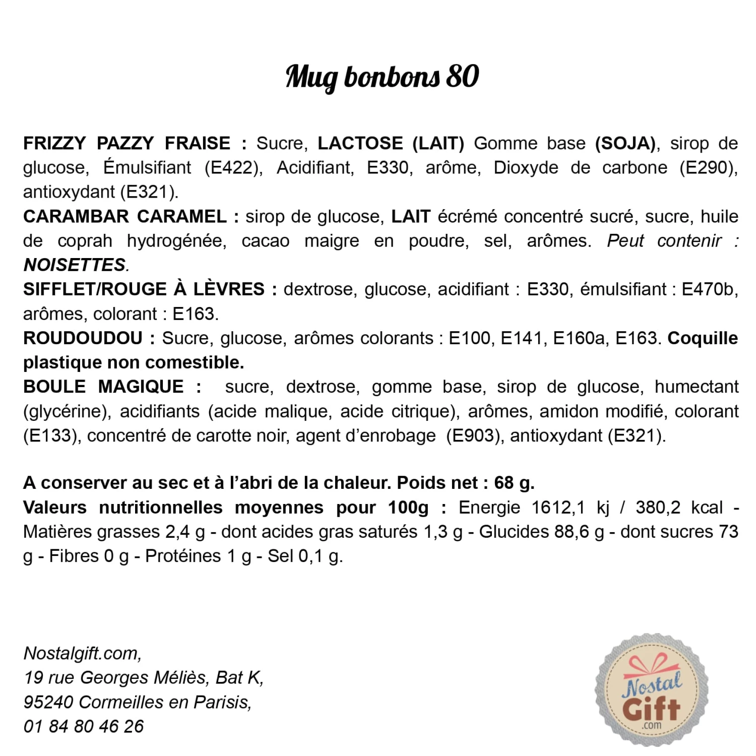 – Contient : 1 Frizzy Pazzy à la fraise, 2 Carambar au caramel, 2 roudoudous, 2 bonbons sifflet dextrose et 1 boule magique