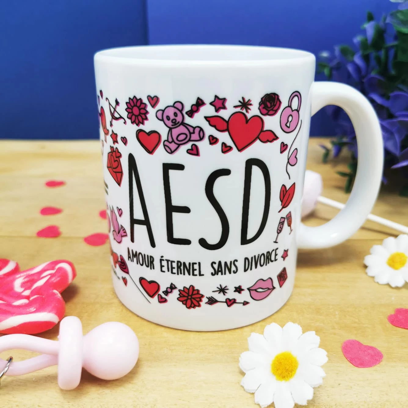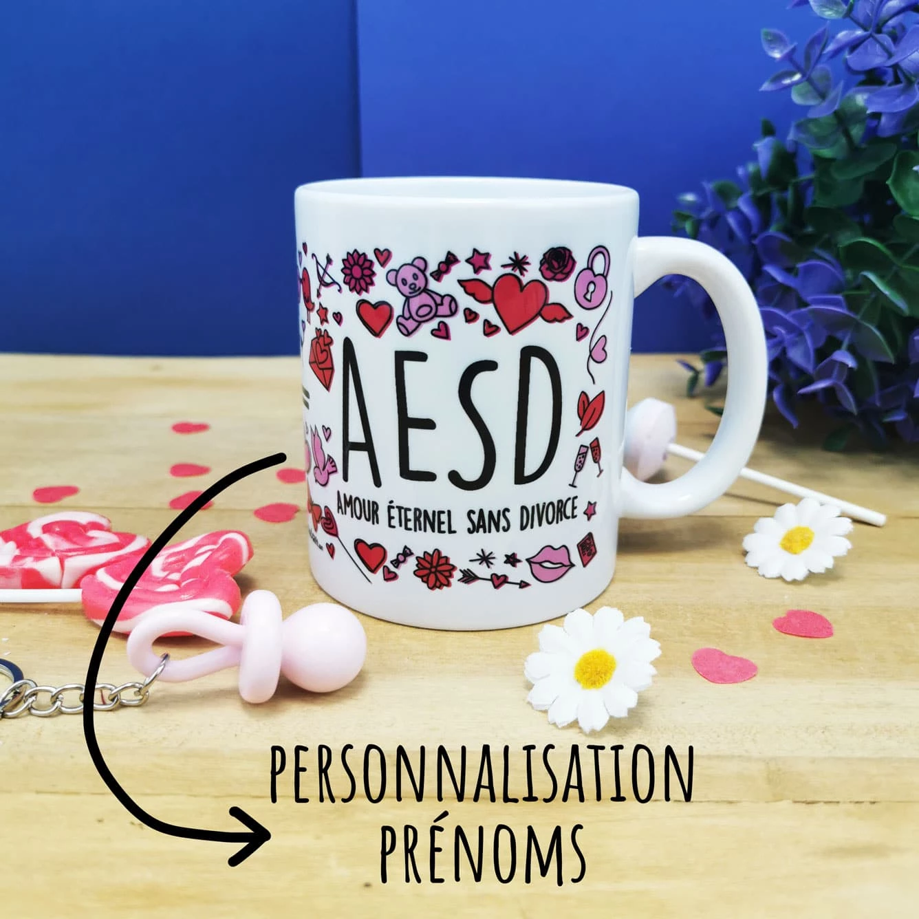 Mug personnalisable “… + … = AESD amour éternel sans divorce”