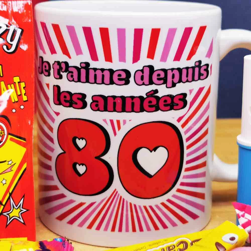 MUG rose “Je t’aime depuis les années 80 ” – Bonbons rétro 80