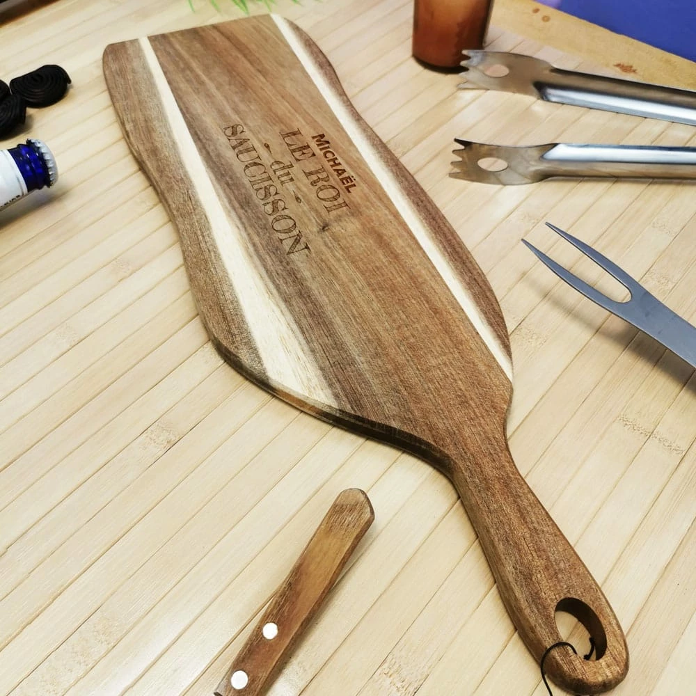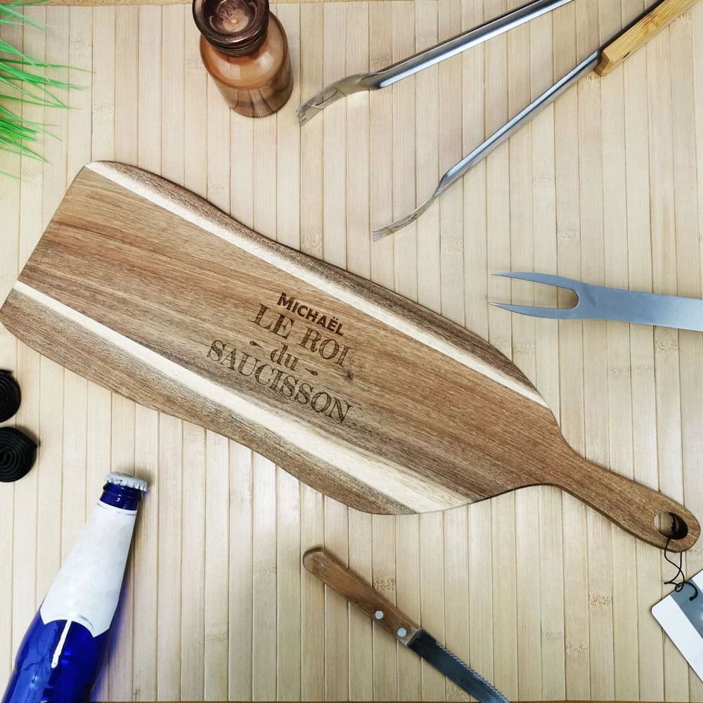 Planche à découper acacia prénom personnalisable – “Le roi du saucisson”