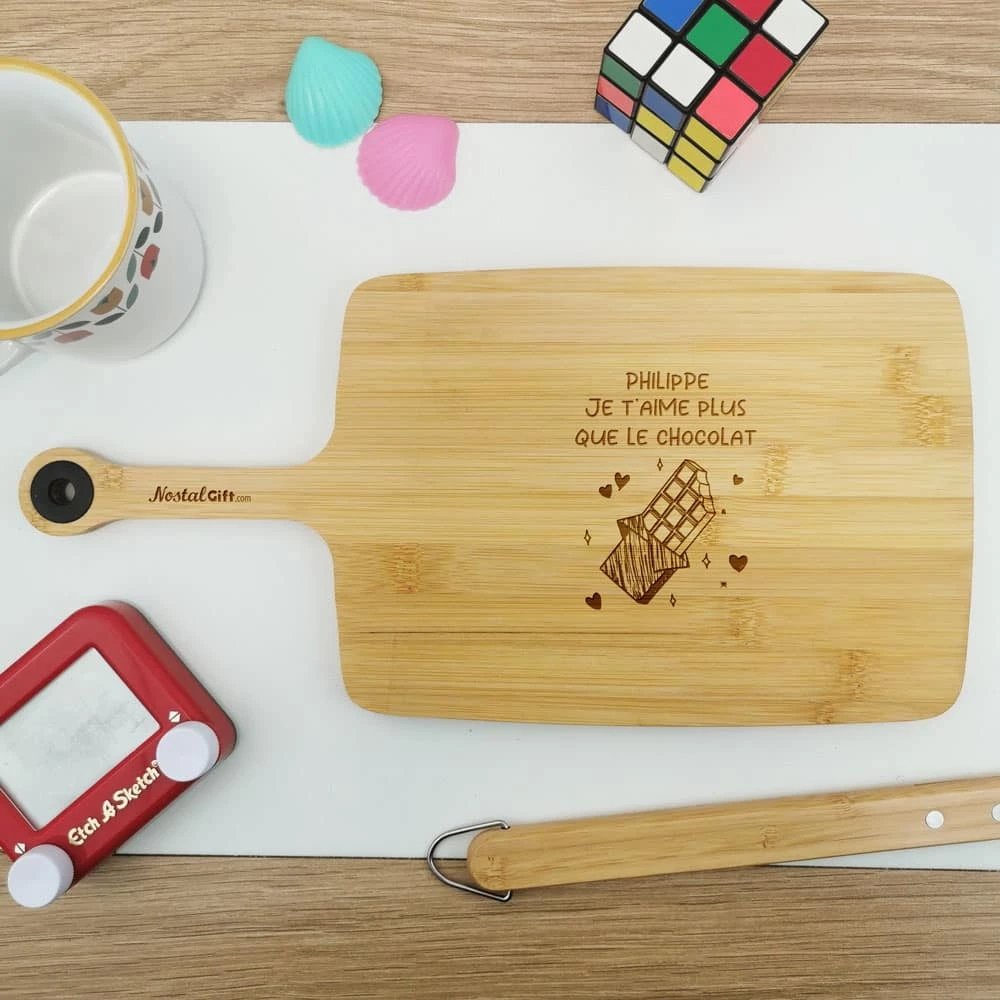 Planche à découper en bois prénom personnalisable – “Je t’aime plus que le chocolat”