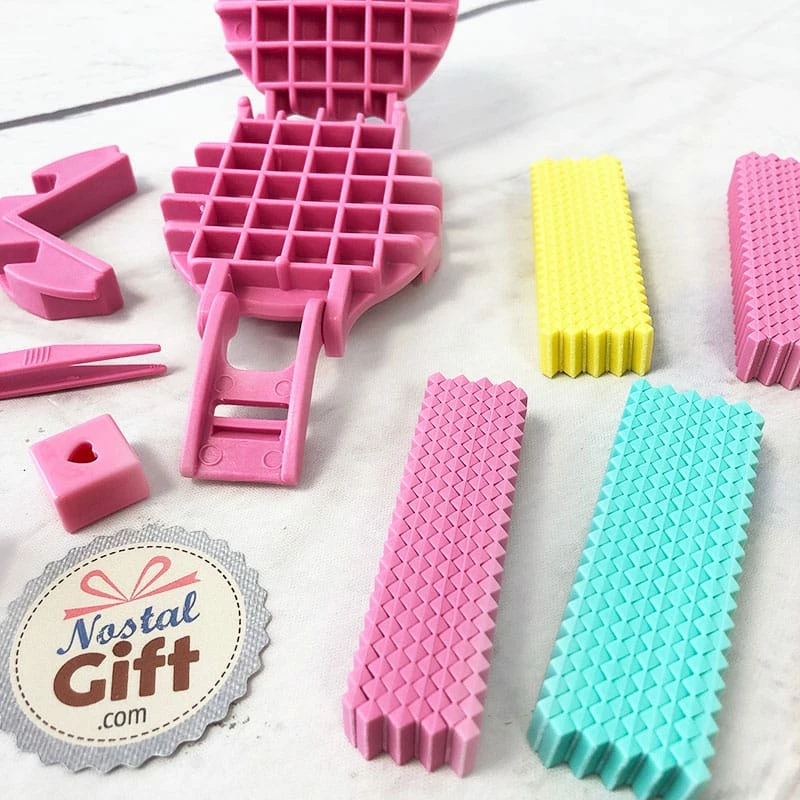 – Contient : Une fabrique à gommes, 7 couleurs de gommes ( rose, jaune, orange, violet, vert, bleu et blanc ).