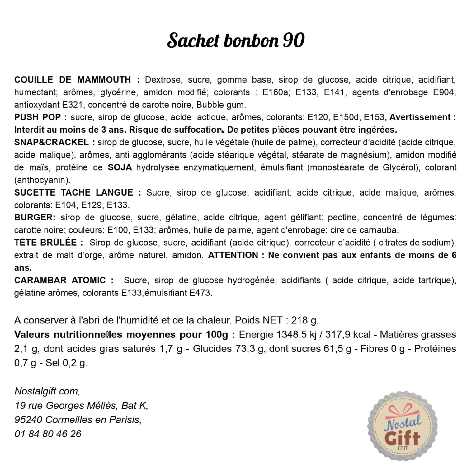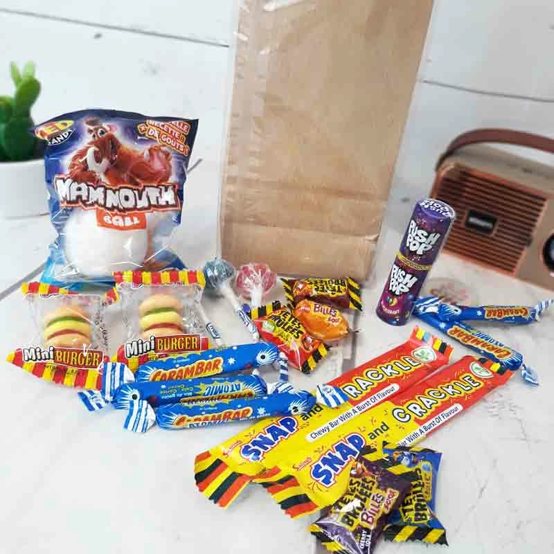 Le sachet contient :- 5 têtes brûlées (gout aléatoire)- 1 push pop (gout aléatoire)- 3 sucettes tâche langue- 1 couille de mamouth- 2 mini Burger- 2 snap crackles- 5 carambar atomic 5 carambar barbe à papa