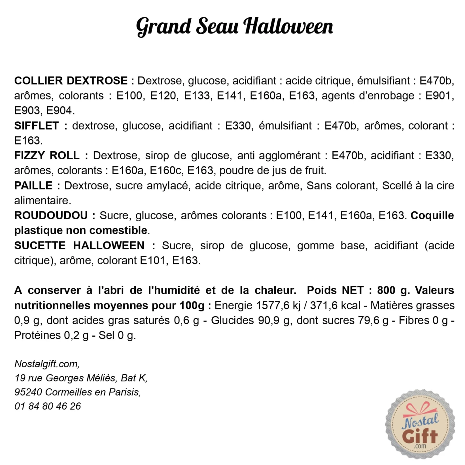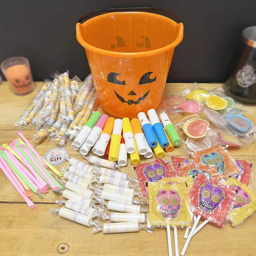 L’assortiment de bonbons Halloween est livré dans un seau en plastique (citrouille). Il contient :