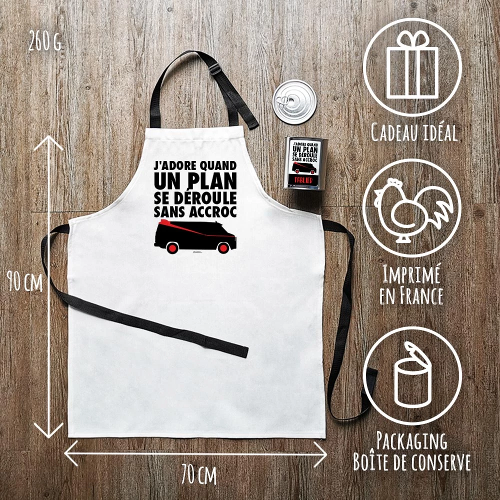 Offrez un cadeau pratique et original pour la fête des grands pères ou fêter un anniversaire avec ce tablier de cuisine sur lequel est écrit “J’adore quand un plan se déroule sans accroc” avec des motif rouge et noir sur l’avant.