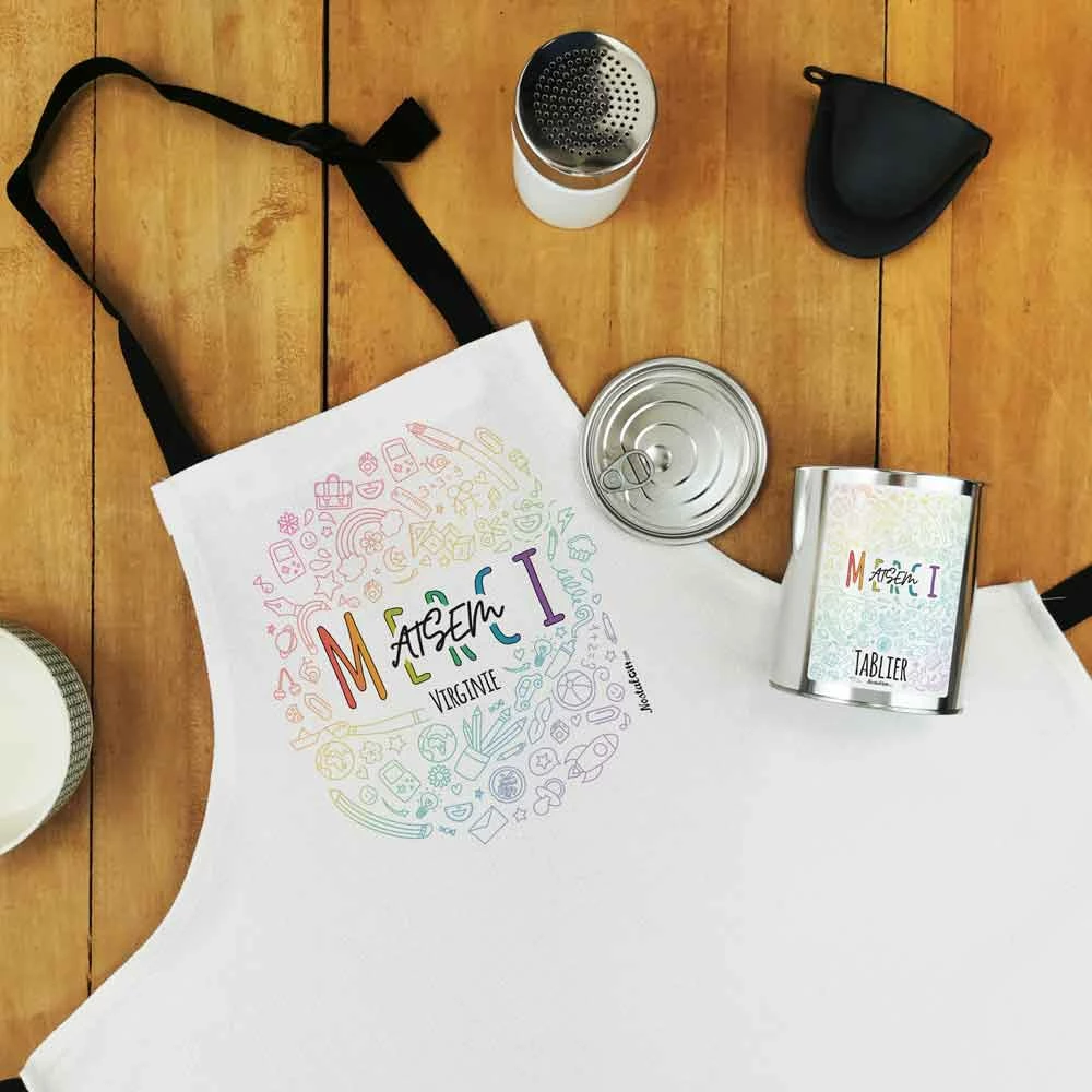 Tablier de cuisine personnalisé – “Merci ATSEM” – Cadeau ATSEM arc-en-ciel