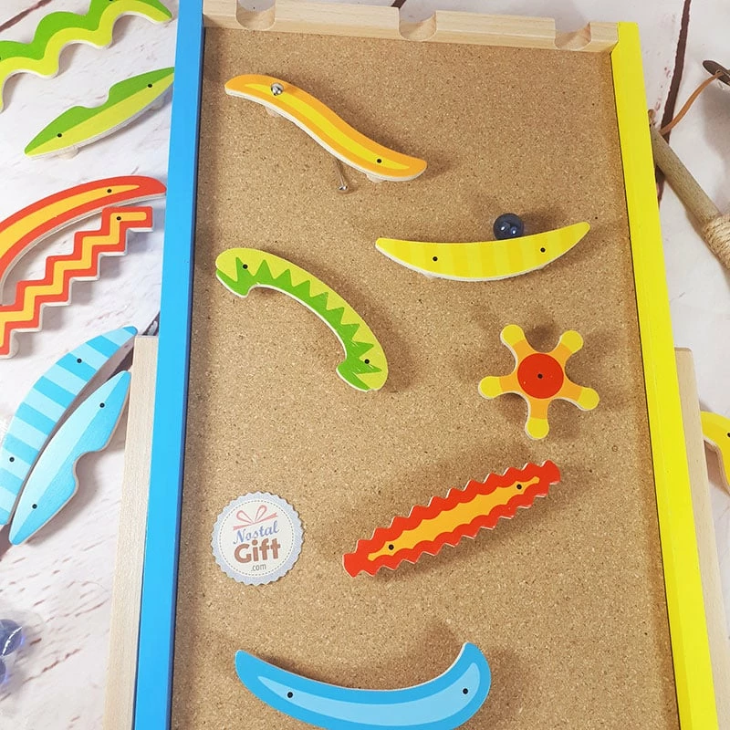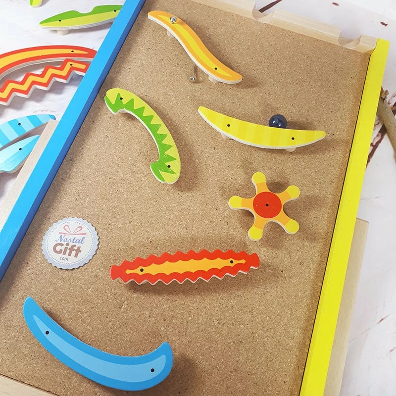 – Contient : 3 billes, 20 pièces en bois colorées et des clous