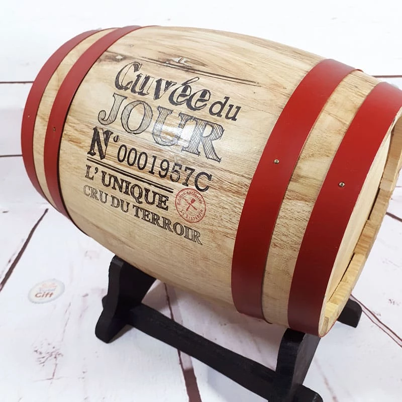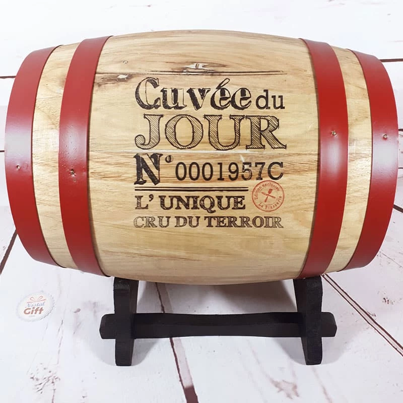 – Contenu : 1 Tonneau en Bois, 1 support en Bois, 1 Poche en aluminium, 1 Robinet en plastique